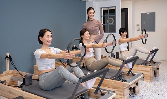 LALA MELLOW PILATESは安心の少人数制(7〜10名)スタジオです。個別指導に近い指導を受けつつ、リラックスした環境で効果的なトレーニングができます。安心感と効果の両方を実感いただけます。
